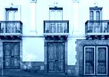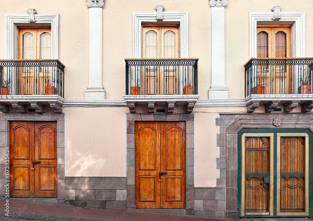 Street view of an old colonial building facade in Quito, Ecuador.