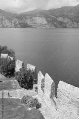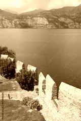 Blick vom Turm der Scaligerburg, Castello Scaligero in Malcesine in Italien auf den darunterliegenden Gardasee mit den Bergen am anderen Ufer