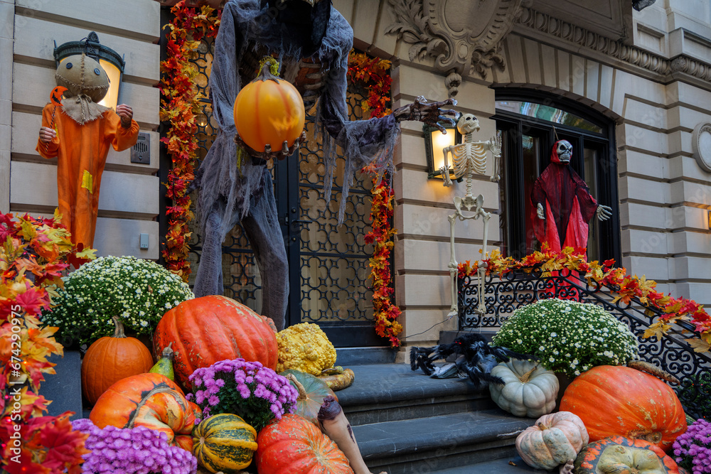 Colorful Pumpkins and Flowers on the Stairs of an Old Brownstone Home in New York City during Autumn. High quality photo