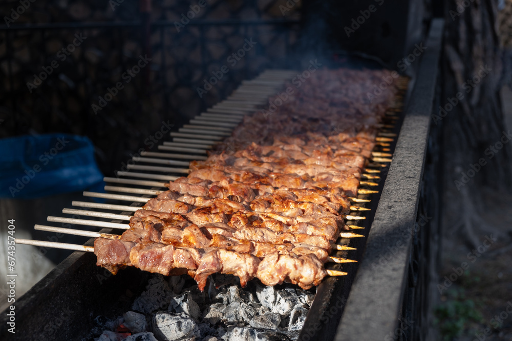 A lot of juicy meat kebabs in a row on the grill. Meat pieces strung on wooden skewers on the grill. The process of cooking kebabs with a lot of smoke. Cooking in nature