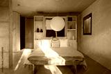 Modern bedroom of a designer farmhouse with a double bed with lots of pillows and large windows that let in lots of natural light