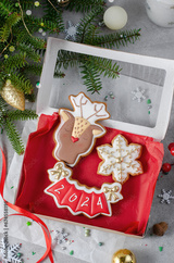 Box of Gingerbread Cookies, Set of Christmas Treats on Bright Background