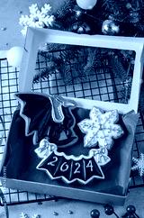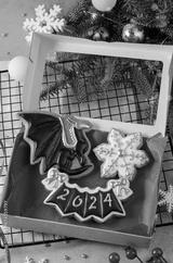Box of Gingerbread Cookies, Set of Christmas Treats on Bright Background