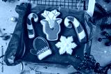 Box of Gingerbread Cookies, Set of Christmas Treats on Bright Background