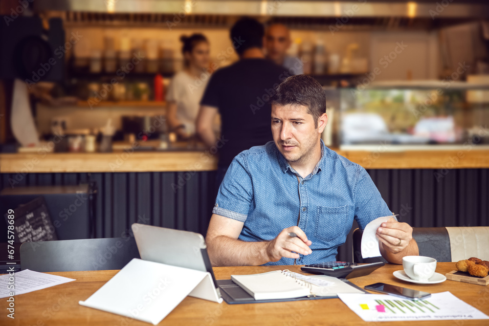 Small business owner calculating online restaurant financial bill taxes and expenses