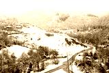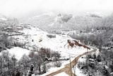 Winter landscape of a mountain village. Houses and trees covered in snow on a hill in Georgia