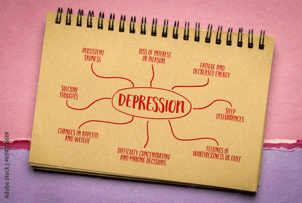depression infographics or mind map sketch in a spiral notebook, mental health concept
