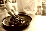 food cooking, profession and people concept - close up of male chef cook with plate of salad at restaurant kitchen table