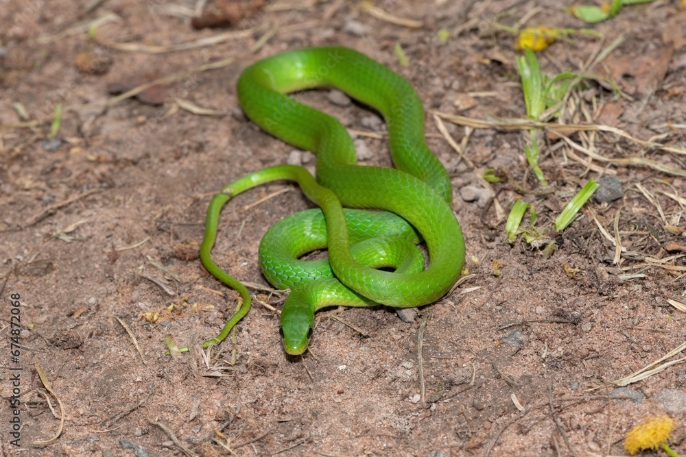 Close-up of a beautiful Green Water Snake (Philothamnus hoplogaster) near a pond