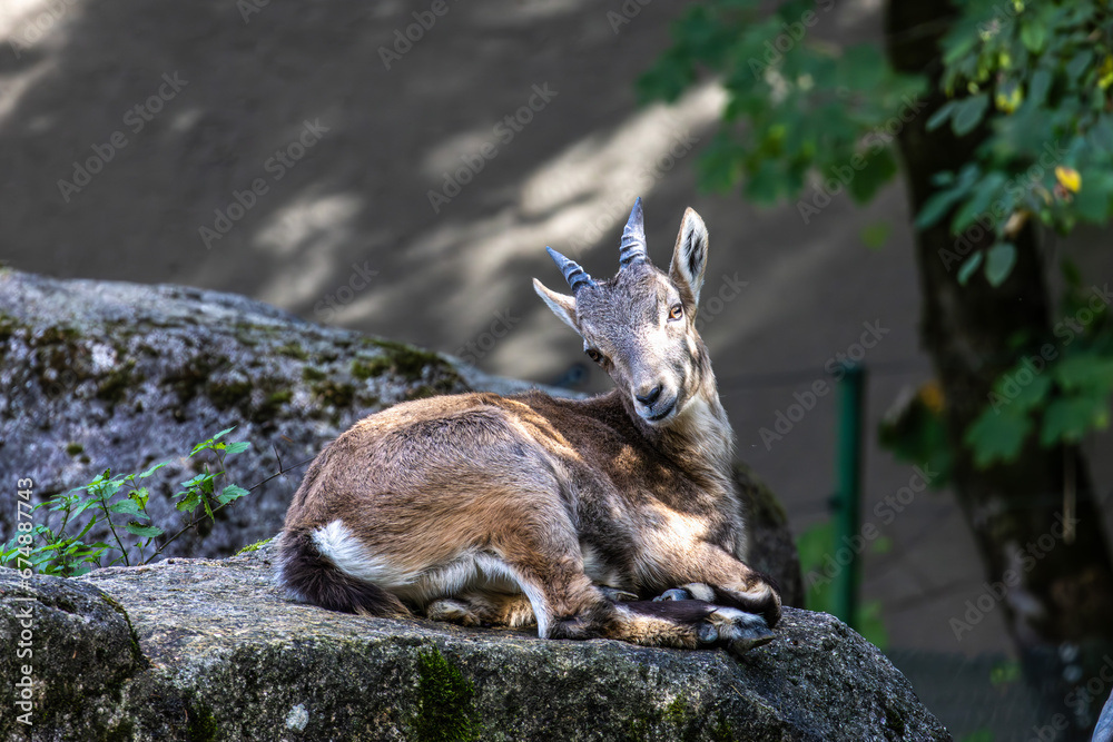 Male mountain ibex or capra ibex on a rock living in the European alps