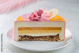 Sliced pink mousse cake with vanilla cream and mango jelly decorated with flowers and chocolate heart.