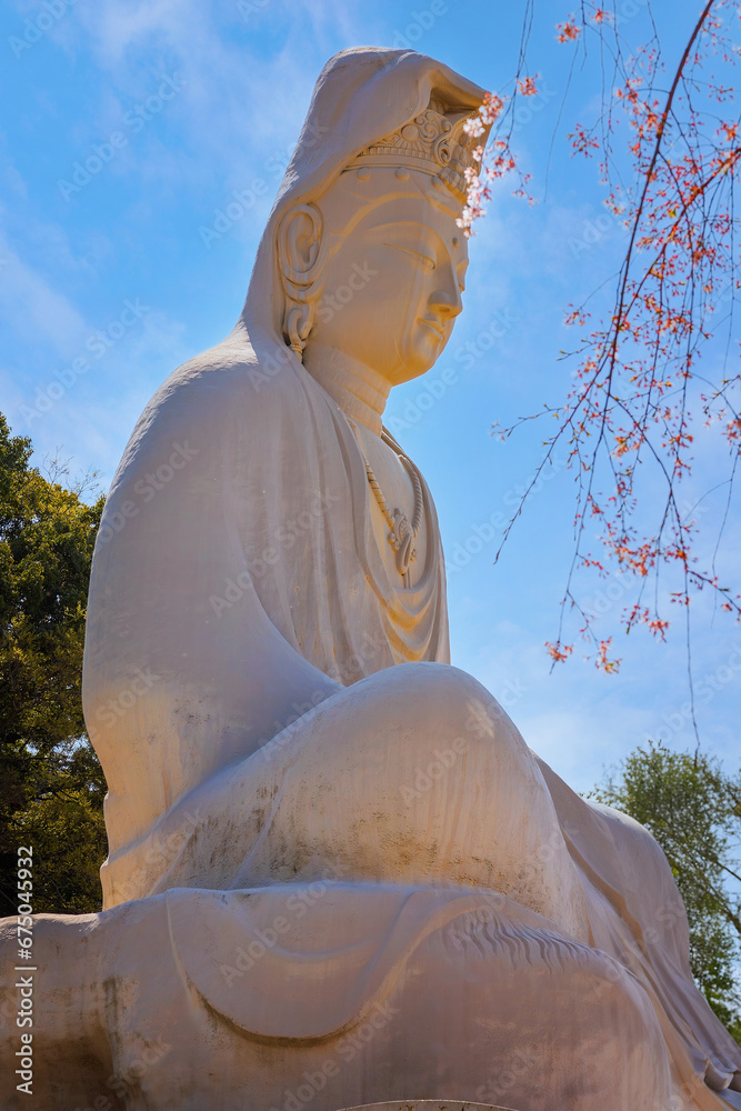 Kyoto, Japan - March 30 2023: Ryozen Kannon Temple is a war memorial dedicated to the fallen both sides of the Pacific War.The 24-meter statue of the Goddess of Mercy was built in 1955