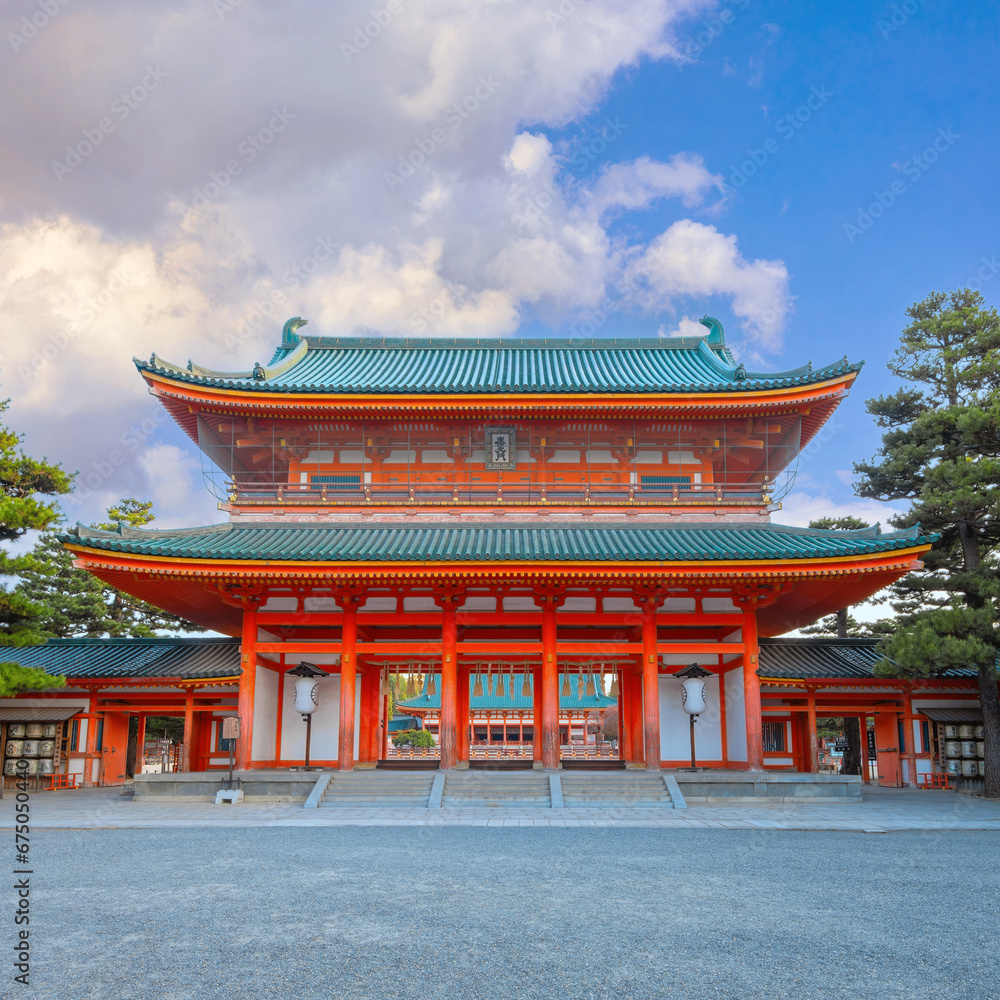 Kyoto, Japan - April 2 2023: Heian Shrine built on the occasion of 1100th anniversary of the capital's foundation in Kyoto, dedicated to the spirits of the first and last emperors who reigned the city