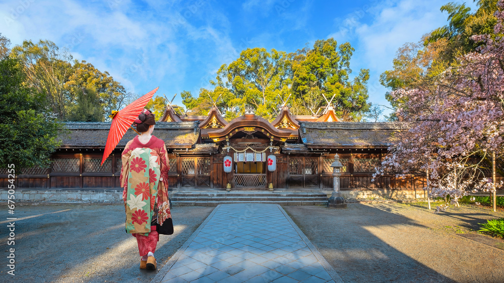 Young Japanese woman in traditional Kimono dress strolls at Hirano-jinja Shrine during full bloom cherry blossom season