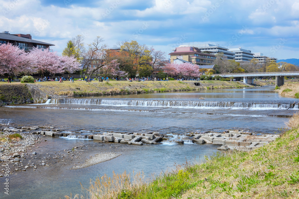Kyoto, Japan - April 2 2023: Kamogawa river is one of the best cherry blossom spots in Kyoto city during springtime