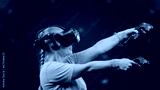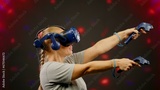 The beautiful woman moves activity in modern virtual reality dance game.Led screen with blur background.The woman wearing VR headset dancing in virtual reality. Concept high technology digital device