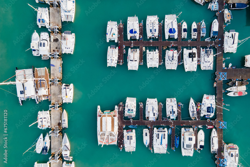 Aerial drone view of Chalong Pier in Phuket, Thailand. Many boats, yachts, sailboats and catamaran moored at the pier platform of Ao Chalong Bay, one of centers to travel around Andaman Sea.