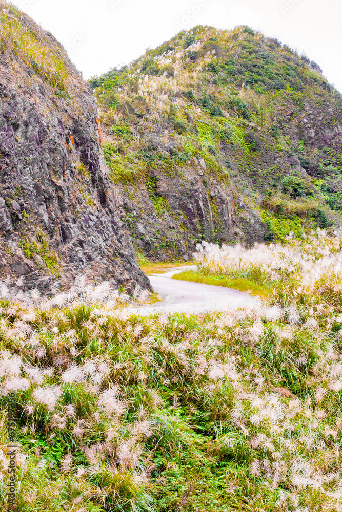 a winding mountain path with a side full of tall Miscanthus grass