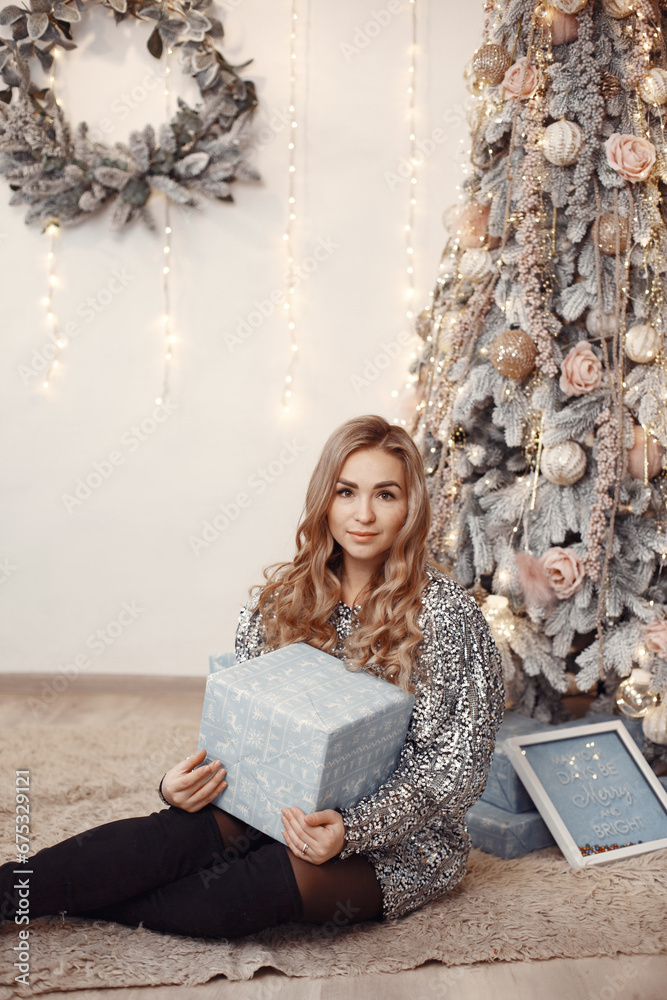 Woman spent time at home in a christmass decorations