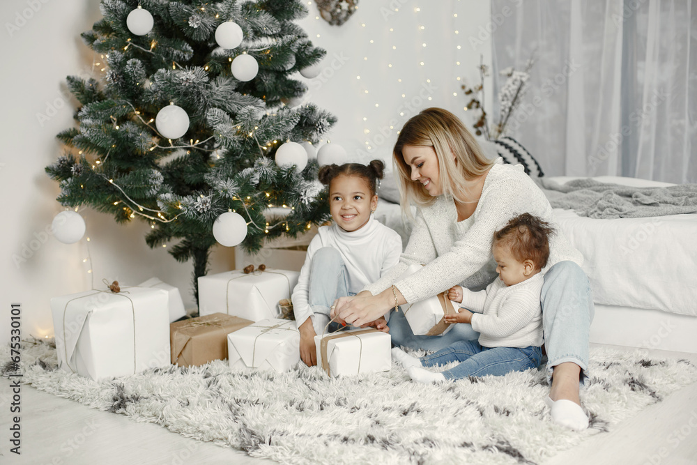 Caucasian mother with two little african daughters at home