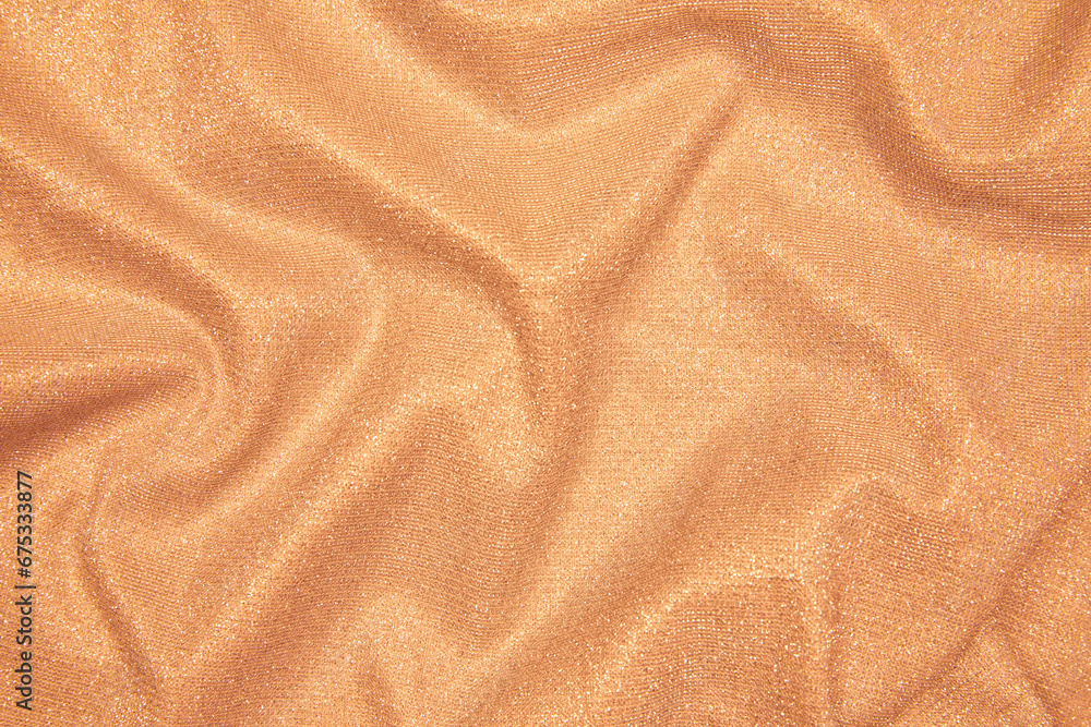 Trendy 80s, 90s, 2000s Background of draped light orange fabric with silver lurex thread. Beautiful fashionable shiny fabric with a shiny thread for making clothes. Textile background texture.