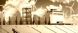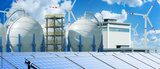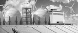 Eco power plant. Solar panels. Wind turbines. Power plant with windmills. Production eco fuel. Green energy. Environmentally power plant in summer weather. Spherical gas storage tanks. 3d image