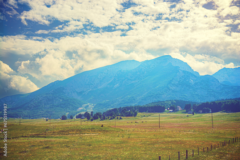 The valley is covered with grass and in the distance there are mountains with clouds.