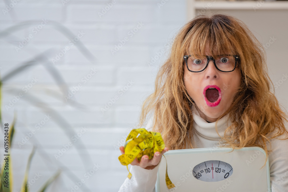 middle aged woman with scale looking at the measuring tape with expression of surprise
