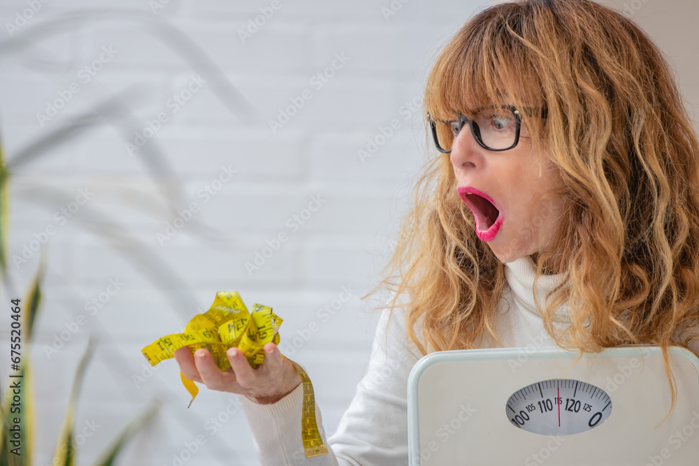 middle aged woman with scale looking at the measuring tape with expression of surprise