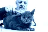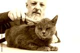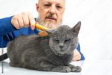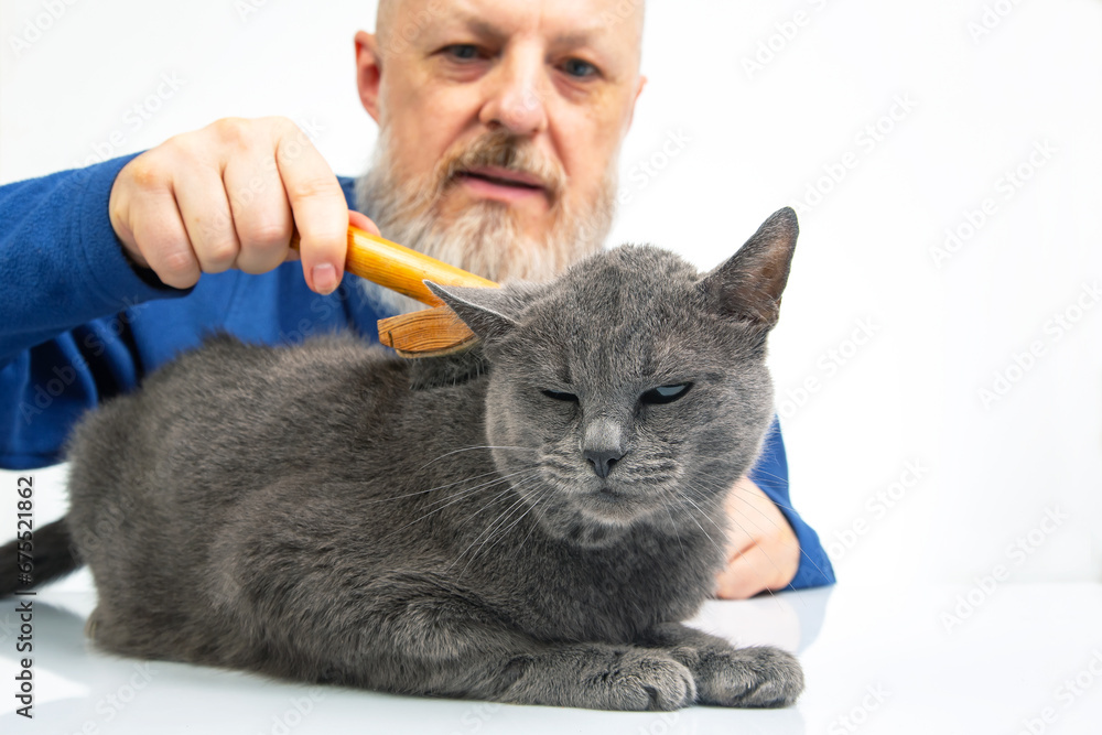 Bearded man combs the fur of a gray cat with a brush on a white background. Pet care