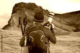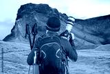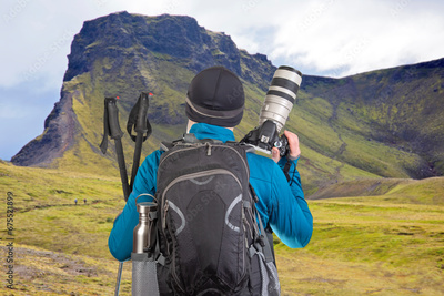 male tourist photographer with a backpack looks at the beauty of nature in the mountains. nature hikes in the mountains