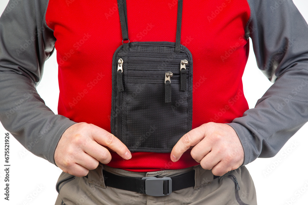 Male tourist with a waist bag for things and documents on a trip. belt bag with a zipper for things and documents while traveling