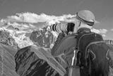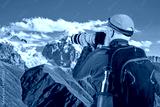 man tourist photographer with a backpack photographs the beauty of nature in the mountains. nature hikes in the mountains