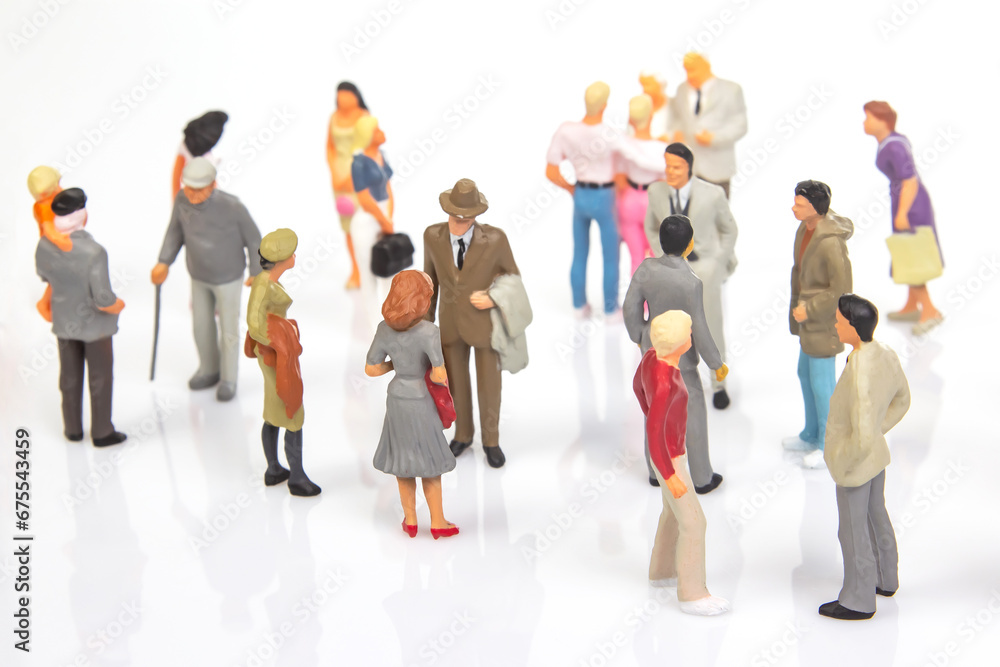 miniature people. group of different people communicate with each other on a white background. concept of communications and relations in society.
