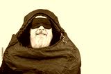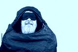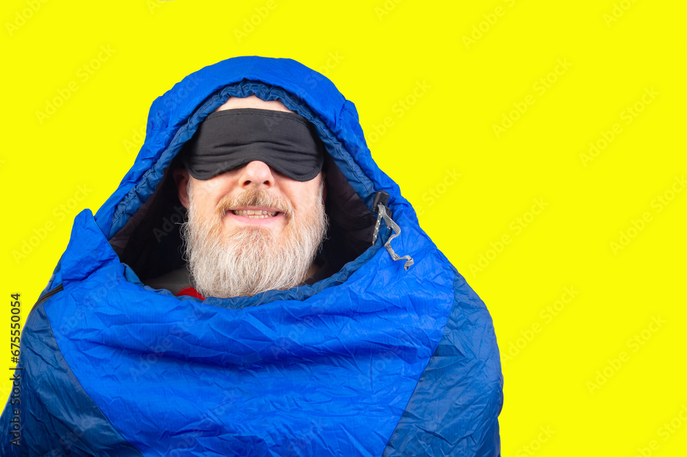 bearded man in a sleeping bag on a yellow background. equipment for recreation in tourism and travel