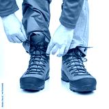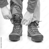 Trekking boots for hiking on the legs of a tourist on a white background. Equipment for travel and hiking