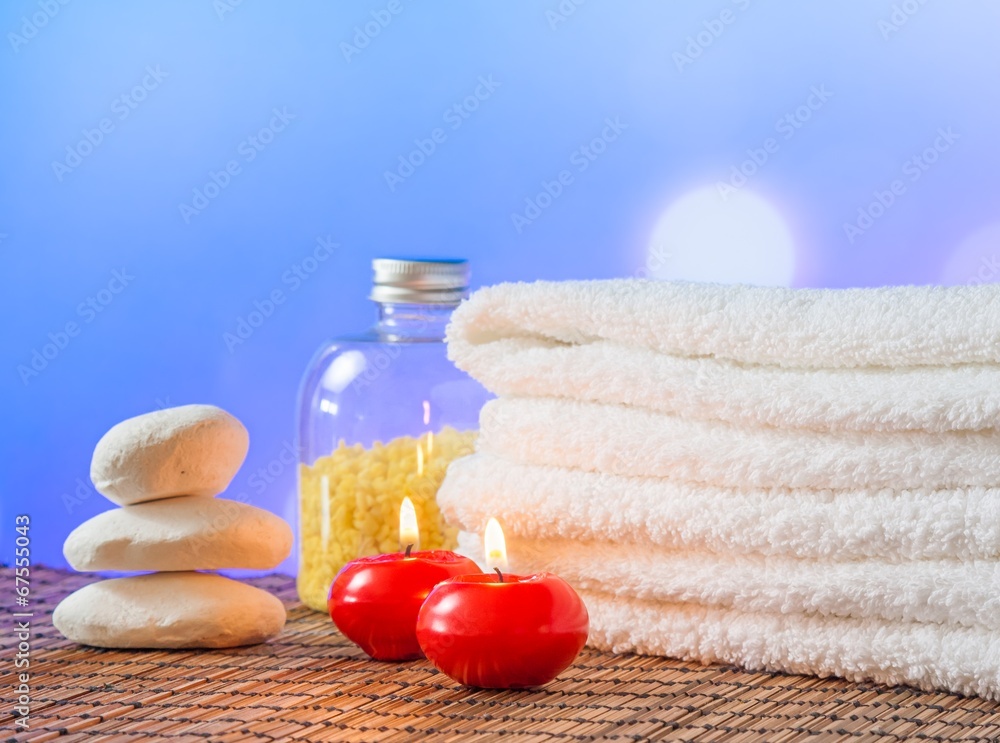 Spa massage border with towel stacked,red candles and stone