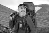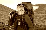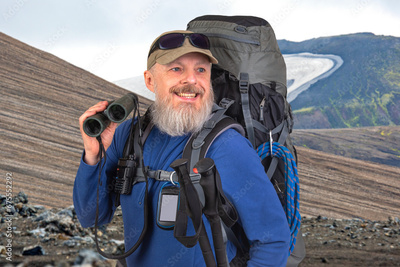 bearded man traveler with tourist equipment and binoculars in hand against the backdrop of a mountain landscape