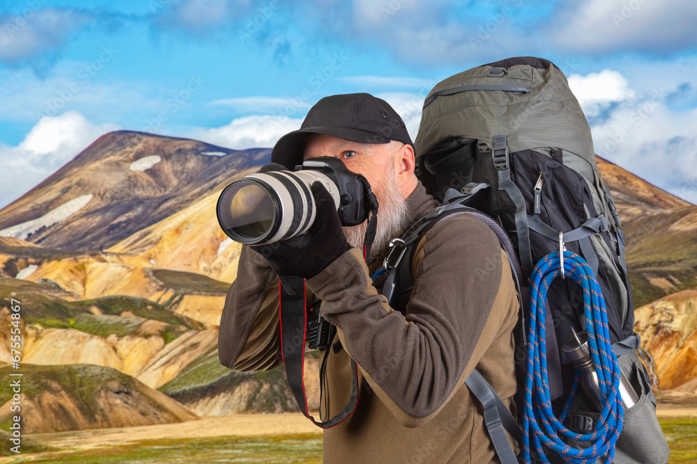 bearded man tourist photographer with a backpack photographs the beauty of nature in the mountains. nature hikes in the mountains