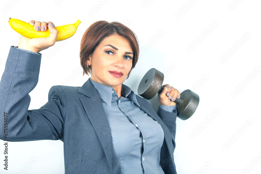 Happy beautiful business woman in a suit lifts a dumbbell and a banana in her hands. Fitness and health. Proper nutrition and excellent results.