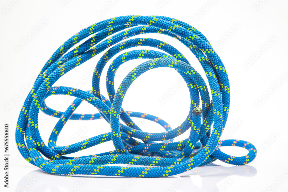 durable colored rope for climbing equipment on a white background. climbing rope. coil of braided cable. item for tourism and travel