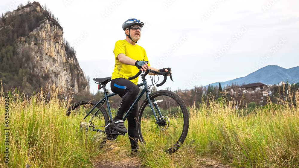 bearded man cyclist in yellow clothes is resting on a bicycle on the road in nature. sports, hobbies and entertainment for health