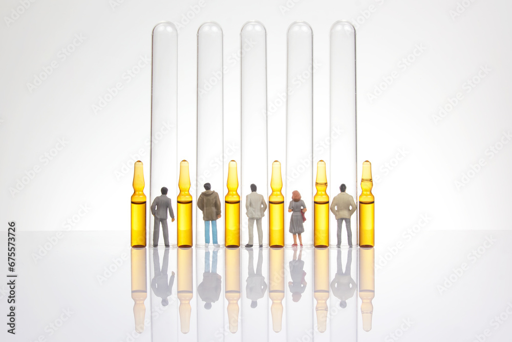 miniature people. people stand near medical ampoules and syringes. concept of vaccination and medical treatment of people lives in society.