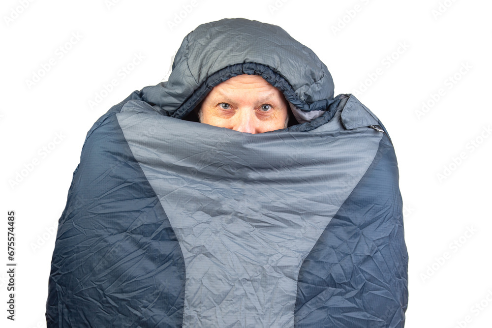 bearded man in a sleeping bag on a white background. equipment for recreation in tourism and travel