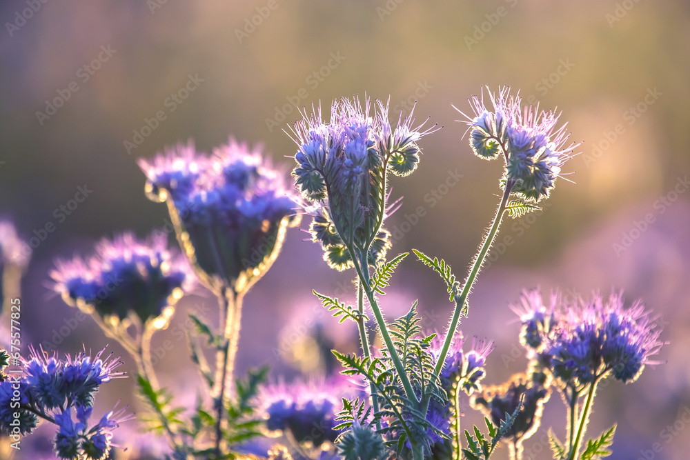 Colorful wildflowers in backlit evening sunlight. The nature of floral botany