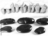 many children's feet peek out from under the blanket against the background of smooth stones. relaxation holiday