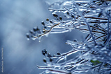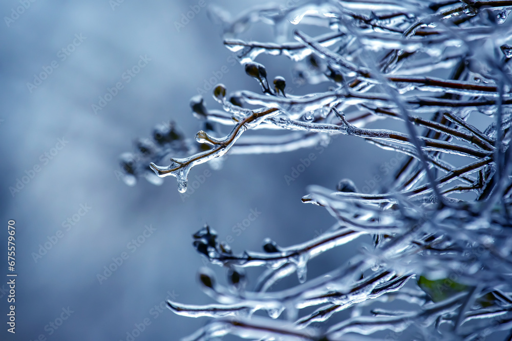 Icicles on icy tree branches. temperature swing season and winter weather in autumn
