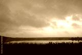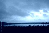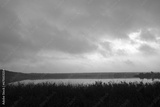 Forest lake in foggy rainy weather. Black and white.
