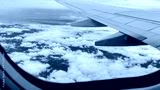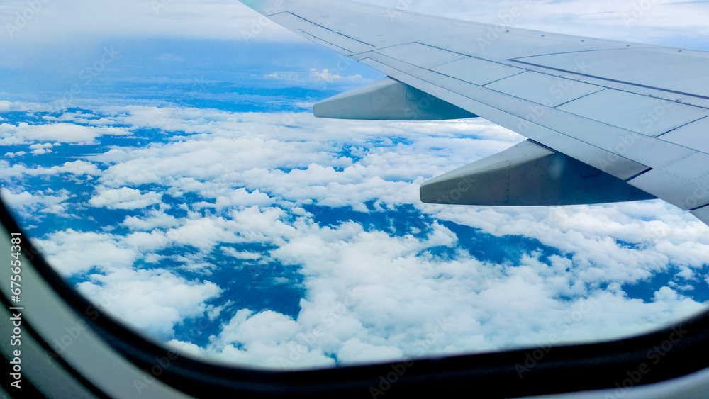 Aerial view of sky and clouds through an airplane window. Travel concept. traveler, trip, vacation, tourism, landscape, vibrant, nature, scenery, background