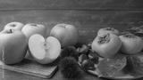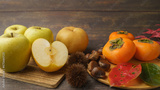 秋のフルーツ イメージ・木目背景|梨・栗・柿・りんご
